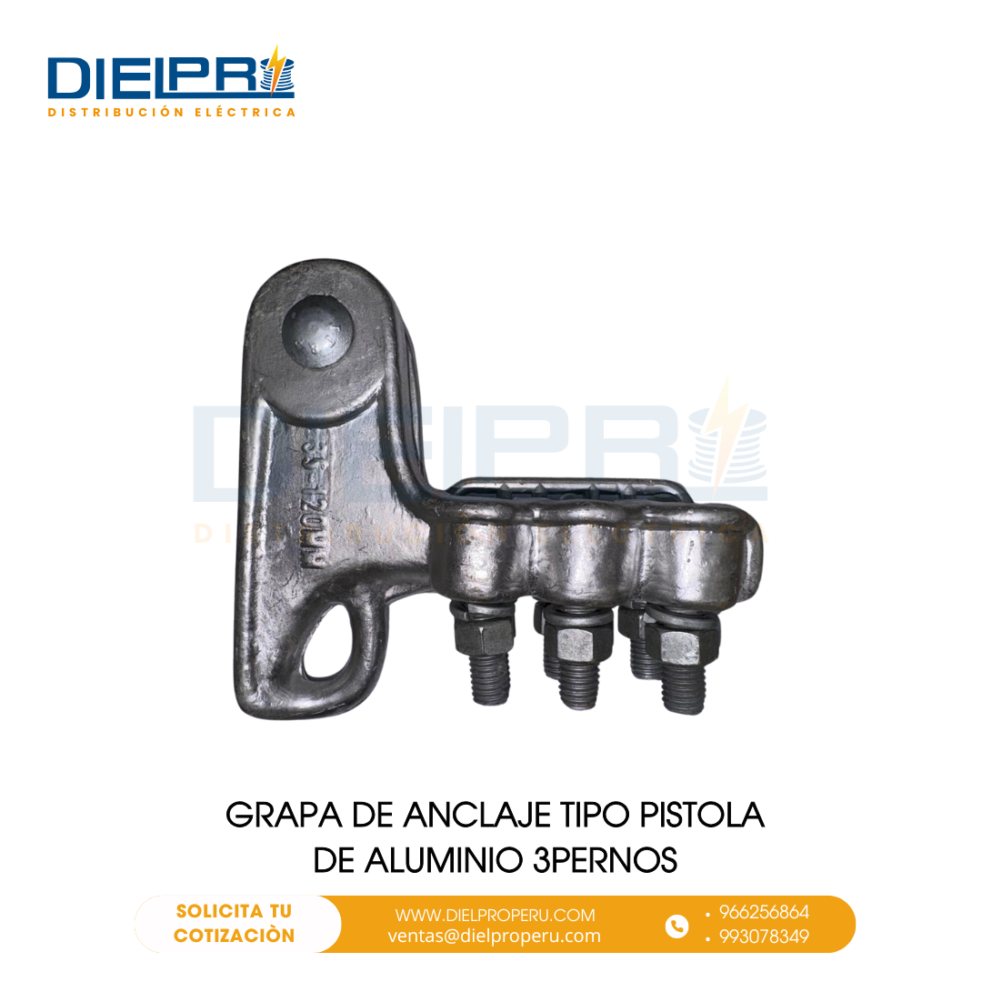 La Grapa de Anclaje Tipo Pistola de 3 Pernos de Aluminio es una solución ideal para la fijación segura y estable de cables en redes aéreas de media y baja tensión. Su diseño tipo pistola y su construcción de aluminio proporcionan una instalación rápida, resistente y duradera, especialmente en aplicaciones que requieren alta resistencia mecánica y un anclaje seguro.